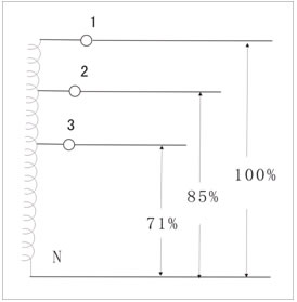 變阻器的繞組上設(shè)備4個(gè)抽頭,一個(gè)抽頭設(shè)在繞組的背面,編號(hào)為N,另外三個(gè)抽頭設(shè)在繞組的正面,抽頭1-N間為100%匝數(shù),抽頭2-N間,3-N之間分別為85%、71%匝數(shù),出廠時(shí)接線接在2N抽頭上即85%匝數(shù)。